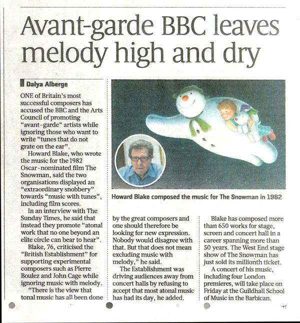 | 4th September 2021 | THE SINFONIA OF LONDON, 'THE SNOWMAN ORCHESTRA' AT THE PROMS 4 Sept 2021, Note by Howard Blake: 'The Sinfonia of London' was a superlative London orchestra founded by Muir Mathieson, who conducted the scores of virtually every major movie made in England from the mid -'30s until 1960, vastly elevating the quality of orchestral film music in the process. Until 1982 I had been directing various 'session' orchestras including the symphonic-sized 'National Philharmonic Orchestra' for Sidney Sax. However, when it came to 'The Snowman', I decided I wanted to form a unique and top-class chamber orchestra consisting of my greatest musician friends: violinist Jack Rothstein, clarinettist Thea King, violist Kenneth Essex, harpist David Snell, and others all of a very high standard. My lead cellist was Peter Willison and he volunteered to book the players and 'Sinfonia of London', as heard in the wonderful 'The Snowman' recording, was a huge success, the film, uniquely made with a soundtrack solely of music, being nominated for an Oscar within days of its release. The recording was heard by the owners of the name, the Walker family,who immediately offerred the name to us, because they felt that it was the first orchestra to attain the very highest standard of orchestral accomplishment relating to film since Mathieson. I used it on various projects of a similar nature following 'The Snowman', including two sequels - 'Granpa' and 'The Bear', but was also working with various other orchestras and ensembles both in London and abroad. During the 80s and 90s Peter promoted the ensemble, particularly for USA movies recorded in London, but by 2018 this activity had somewhat slowed down and when John Wilson asked if he could have the name 'Sinfonia of London' we were pleased to give it to him. | |||||